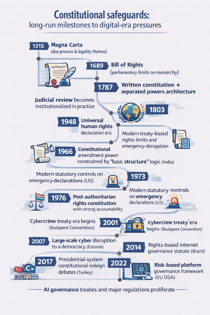 Supporting sources for the timeline include Magna Carta translations, the Bill of Rights 1689, the US Constitution transcript, ICCPR emergency rules, modern emergency governance statutes, South Africa’s constitutional text, Estonia cyber incident documentation, Brazil’s internet rights framework, EU digital governance regulations, and the AI governance treaty ecosystem. [32]