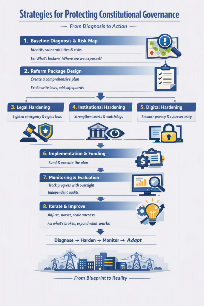 | Policymakers (executive + legislature) | Tighten emergency powers with sunset clauses, legislative renewal, and judicial review; professionalize oversight & inspections; strengthen information integrity and platform governance without chilling lawful speech; modernize privacy/cyber governance using risk-based safeguards | Shorter average duration of emergency declarations; higher legislative oversight compliance; improved rule-of-law and judicial-constraints indicators; reduced public-service corruption and higher trust [10] |